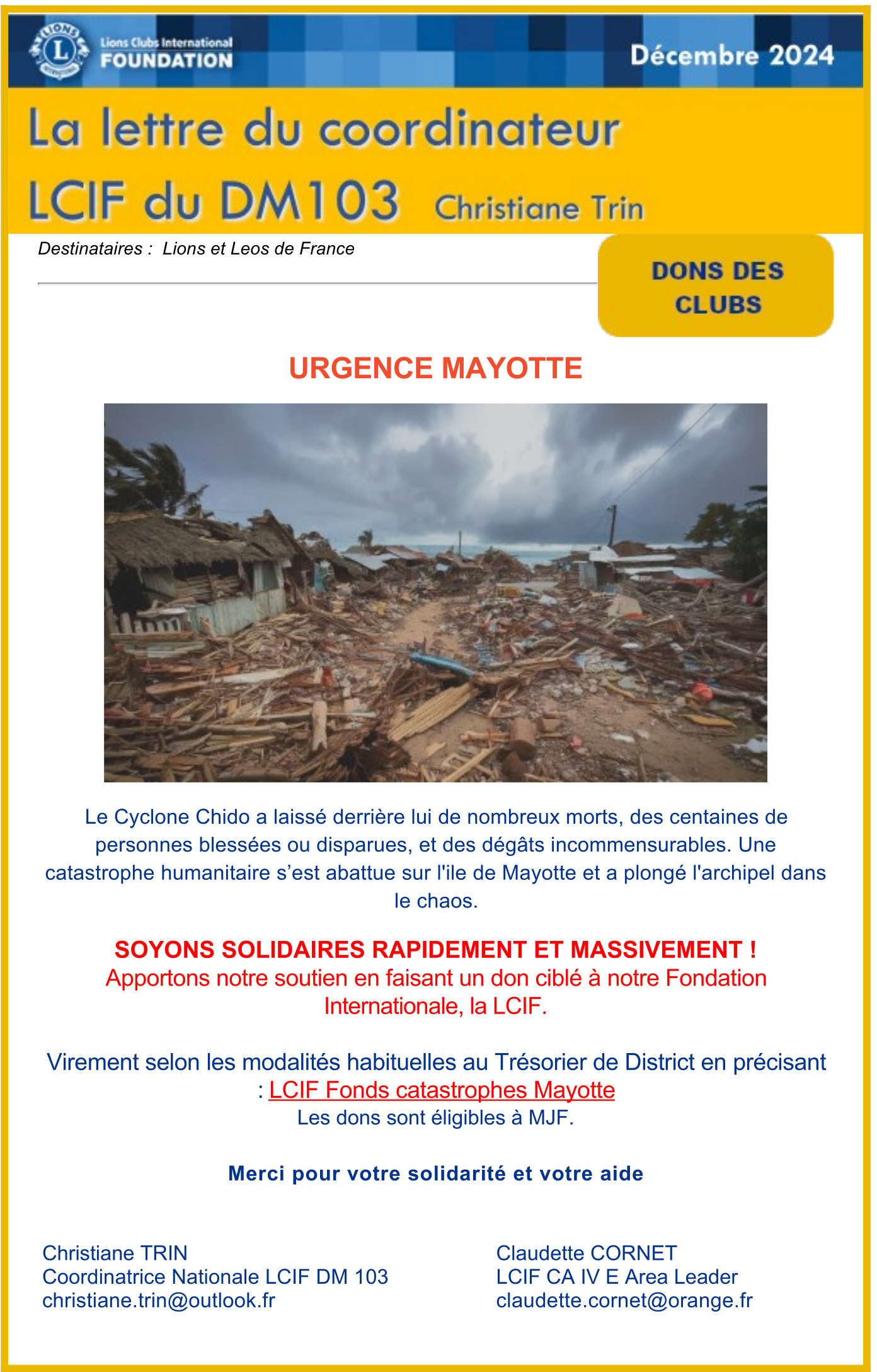 Grace à vos dons récoltés en 2024, notre club a apporté sa contribution à l'action lancée par la Fondation Internationale du Lions Club pour Mayotte.