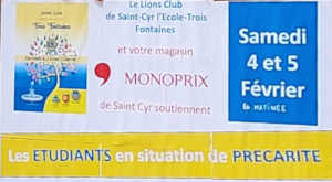 Collecte pour les etudiantsAvec la participation du Monoprix de Saint Cyr l'école, nous avons collecté vos dons au profit du CROUS de notre académie. Ces dons furent une nouvelle fois chaleureusement accueillis et seront redistribués au plus vite auprès des étudiants de notre région.